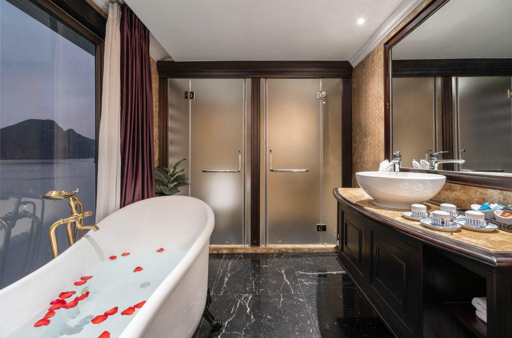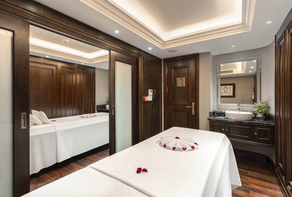 An expansive two-level sundeck, outdoor jacuzzi and signature glass bridge bring you closer to the limestone peaks of the bay, while refined cabins provide a calm retreat at the end of the day. With clearly separated zones, the ship offers both lively shared spaces and quiet corners for two, making it a natural choice for Vietnam honeymoons and intimate celebrations framed by iconic bay views.