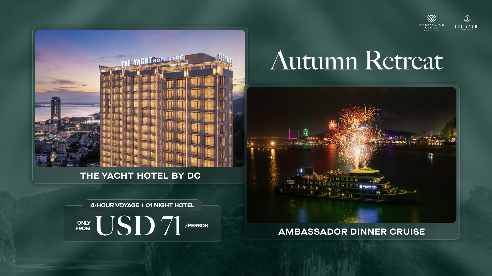 Elevate your luxury retreat in the World Heritage Site with the all-in-one package featuring Ambassador Dinner Cruise and The Yacht Hotel by DC. Combining a stylish stay at The Yacht Hotel with a captivating 4-hour voyage aboard the grandest dining cruise in Halong Bay, this experience offers the best of both worlds - exceptional hospitality on land and at sea.