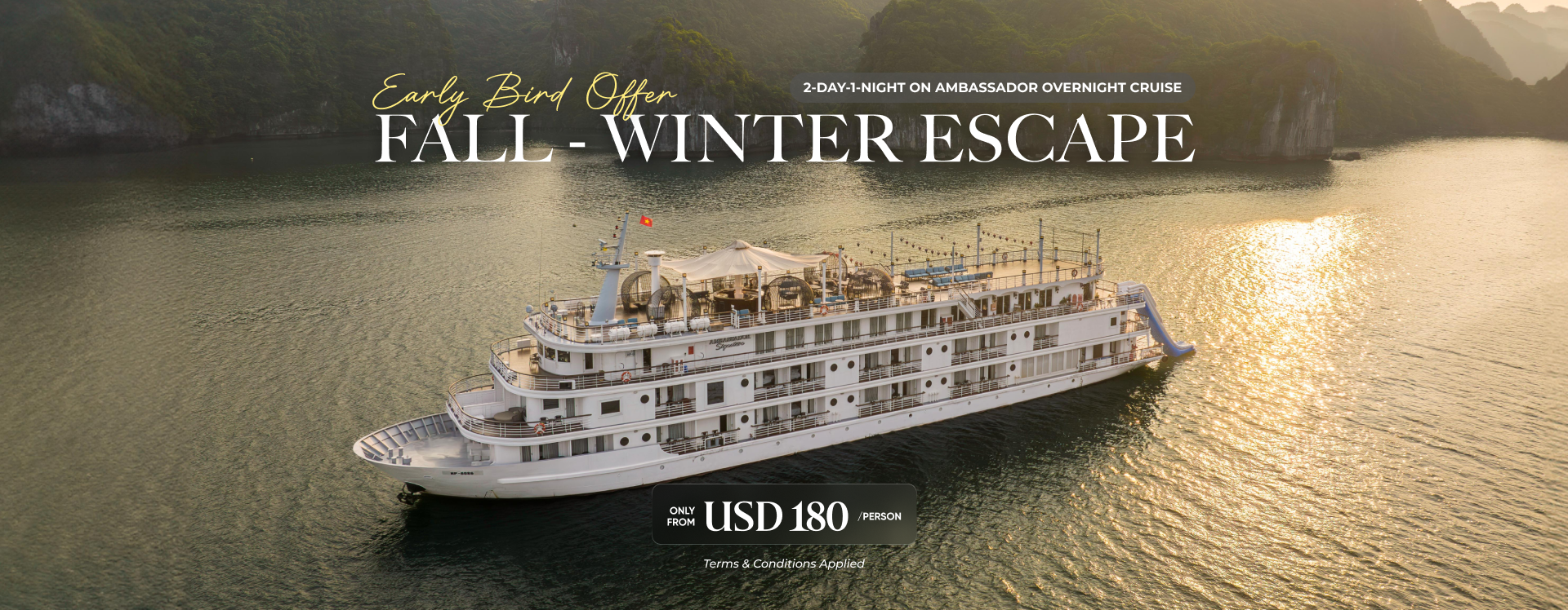 Discover Ha Long Bay & Lan Ha Bay - the natural wonders in a completely different way with Ambassador Overnight Cruise. With an overnight stay on the most comfortable cruise, you will be immersed in the vast ocean space, admire the breathtaking beauty of thousands of rocky islands and enjoy high-class amenities.